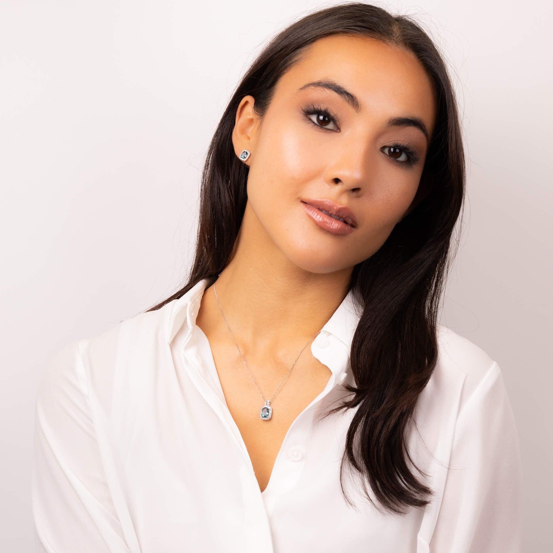 Crafted in 9ct white gold, this pendant boasts a mesmerising oval blue fluorite and surrounding white topaz stones, echoing the serene and dazzling waters of the Amalfi coast in Italy. Continuing this homage to coastal beauty is the double bale, adorned with more glistening white topaz stones, ensuring every angle exudes a brilliance that mirrors the sun-kissed reflections on the Mediterranean waves. This pendant radiates sophistication and allure, making it a must-have addition to any jewellery collection, especially when paired with the matching stud earrings.