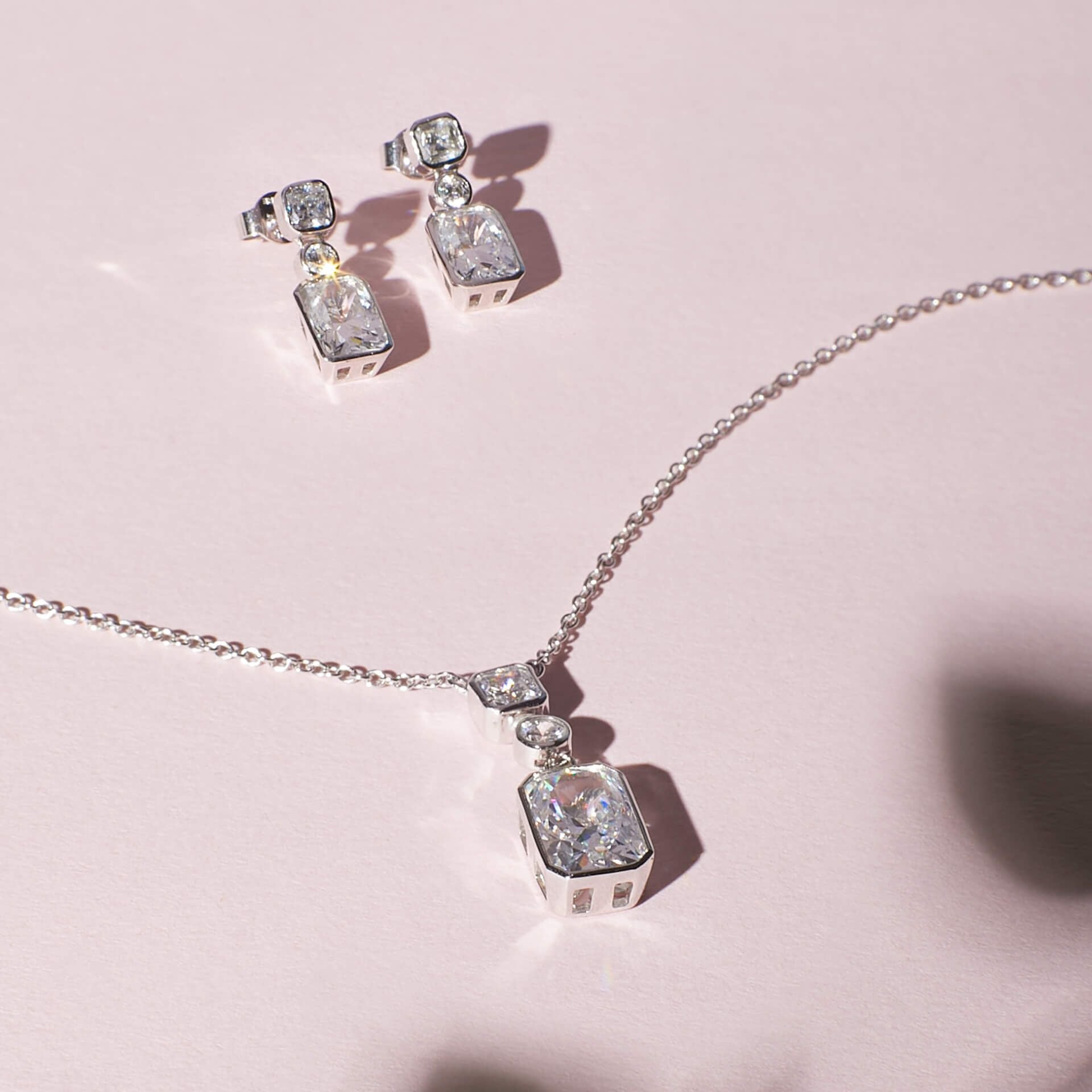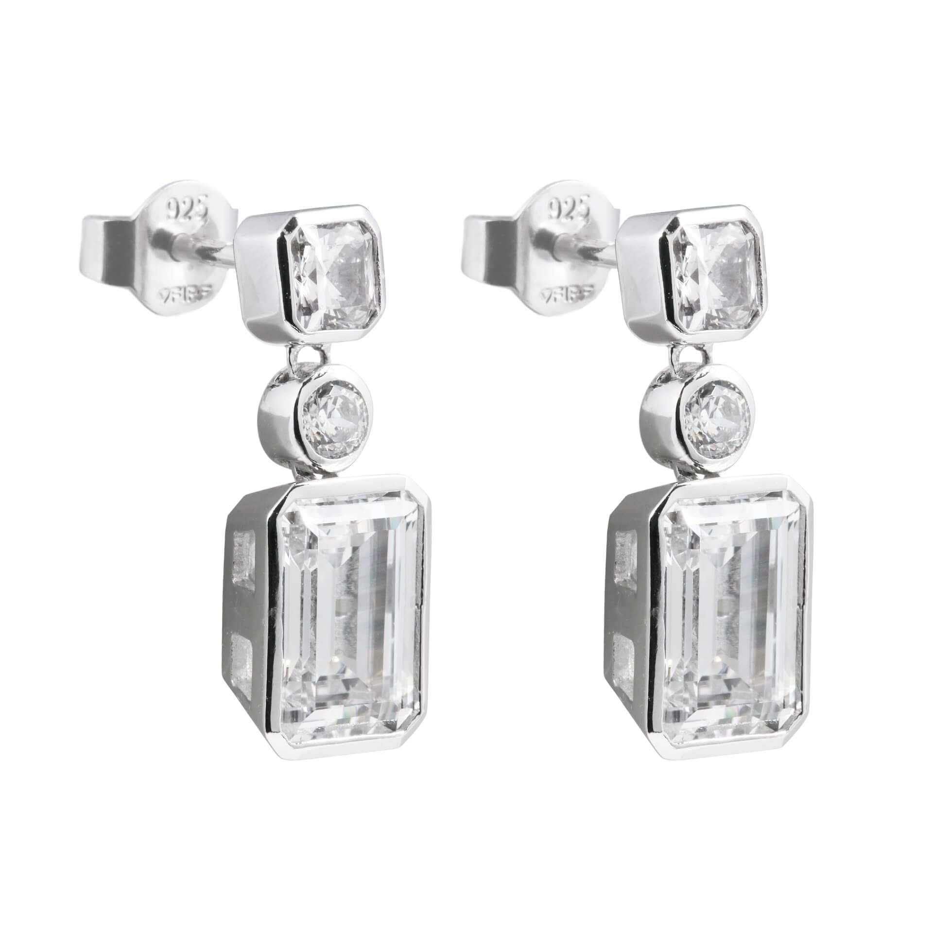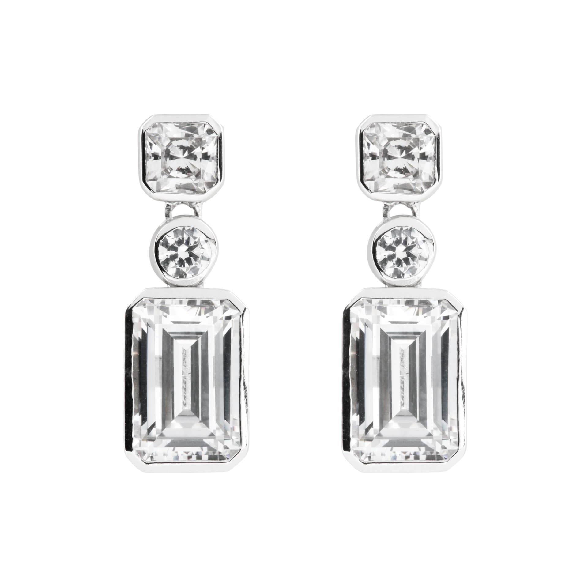 Featuring three different cuts of our Diamonfire zirconia stones, including emerald, round and princess cut, these drop earrings are crafted in triple plated sterling silver and give a new meaning to added dimension! The light catches each stone in beautifully different ways when worn for the most eye catching look! Make sure to pair with the matching necklace to complete the ensemble.