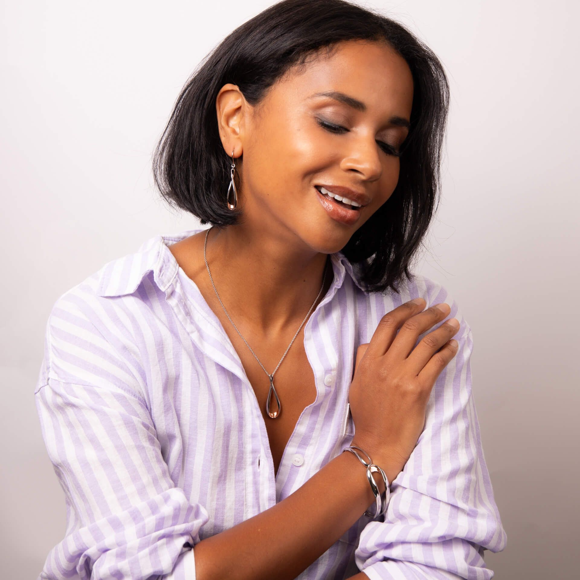 An elegant twist loop bangle with rhodium and rose gold plating. Flowing folds and free formed shapes, these pieces are eye catching and bold, with the added luxury of rose gold plating.