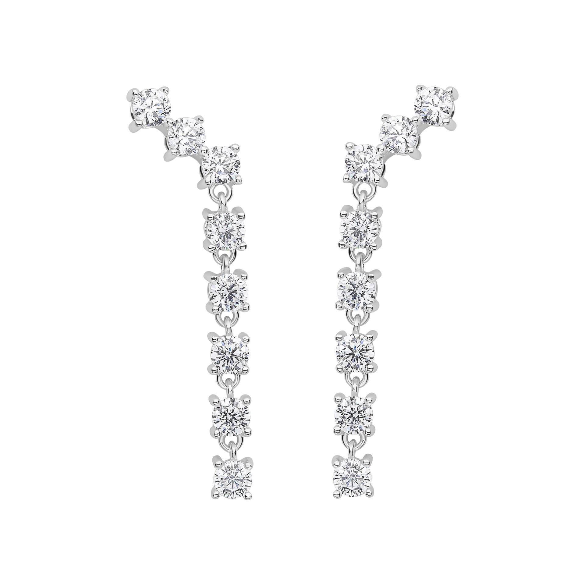 These earrings are a testament to the power of simplicity. Featuring graduated sizes of cubic zirconia stones that cascade gracefully along the entire length of each earring, a mesmerizing play of light and shadow is created. With a design that is uncomplicated yet captivating, these earrings are crafted in recycled sterling silver and will certainly be the centre of attention when worn, especially if paired with the matching necklace.