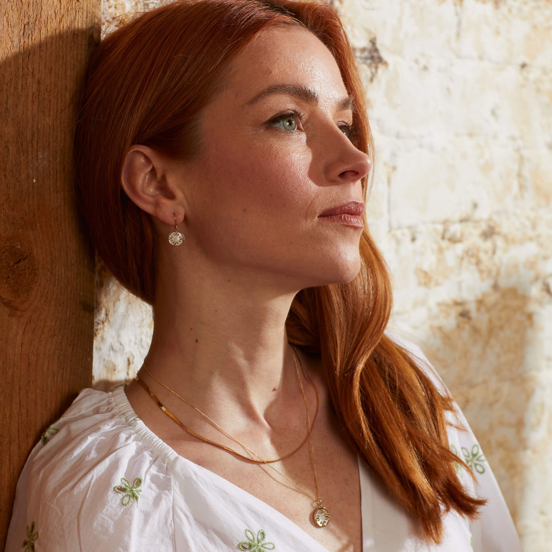 Featuring a hook fitting for effortless wear, these earrings epitomise elegance. Crafted in 9ct yellow gold, the mother of pearl inlay nestled within the golden discs reflects opulent tones whilst intricate swirl patterns delicately embellish the mother of pearl from all angles. The fusion of luxurious gold and iridescent pearl creates a captivating allure that will lend a touch of refined glamour to any outfit. Make sure to pair with the matching pendant for a complete style.